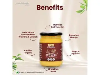 Organic Bilona Cow Ghee is a pure cow ghee made using churning of organic milk from Indian cows which live on organic farms and eat preservative free natural fodder. The bilona process to make bilona cow ghee begins by curdling milk into yoghurt which is then churned in small batches to extract butter. This organic butter is then slow cooked to create rich aromatic Bilona cow ghee. This organic bilona cow ghee is completely natural and is without any additives, chemicals, or preservatives. The cows are given no stress hormones and taken care of as a family of the farmers. Bilona Cow Ghee is easy to digest and can be used in cooking ,baking, frying and sauting in Indian kitchens. It is rich in fat-soluble vitamins like A, D, E, and K which are easily absorbed by the body. Barsana Magic Bilona cow ghee is lab tested for purity and it hols organic certifications by Government bodies for the authenticity you can trust for your family. Bilona cow ghee can be consumed by all age groups specially beneficial for elderly and kids since it is comparatively easier to digest. It helps to regulate healthy cholesterol helping to maintain heart health. Experience the richness and purity of tradition with Barsana Magic Organic Bilona Cow Ghee.