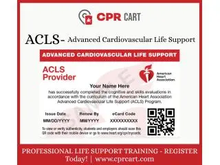 Stay current with AHA ACLS guidelines through CPR Cart’s efficient training program. Begin with self-paced online coursework that reviews advanced resuscitation algorithms, airway management, cardiac rhythms, medications, and post-cardiac arrest care. Complete a short, structured skills check to demonstrate competency. Upon completion, CPR Cart issues your official ACLS Provider eCard instantly, helping you meet hospital and employer compliance requirements with ease.