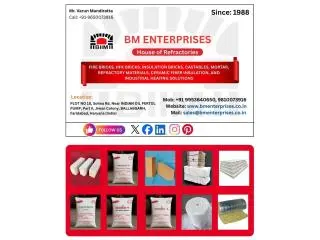 BM Enterprises is a well-known and trusted maker of the best refractory materials in Delhi NCR. They make high-quality refractory products for furnaces, kilns, boilers, and other industrial uses that require high temperatures. The company has a strong presence in Delhi and provides reliable refractory materials for steel, ceramics, cement, and foundries, known for their heat resistance, durability, and energy efficiency. Customers at BM Enterprises can choose from a wide range of products, such as fire bricks, insulation bricks, ceramic fiber blankets, ceramic fiber boards, and other cutting-edge thermal insulation solutions. Each item is carefully chosen and made to meet industrial standards, so it lasts a long time and works the same way even in very hot or cold weather. BM Enterprises is one of the best places in Delhi to get refractory. They focus on quality, low prices, and reliable delivery. Because they use industrial-grade materials and care about their customers, they are a popular choice for businesses in Delhi NCR and nearby industrial areas that need long-lasting refractory solutions.
