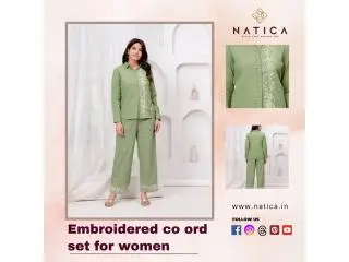 Natica brings elegance and comfort together with its beautifully crafted embroidered co-ord set for women, designed to elevate your everyday and festive style. Our co-ord set is made from the finest fabric and features elaborate embroidery that adds a touch of class to your wardrobe. Whether you're heading out for brunch, a casual gathering, or a special event, this outfit strikes the perfect balance between tradition and trend. The co-ord set is designed for a flattering fit, ensuring you feel confident and stylish all day long. Shop now for the latest embroidered co-ord set for women.