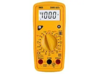 Need a high-performance Digital Multimeter for electrical testing? The DMM 603+ measures voltage up to 1000V DC, current up to 20A, and resistance up to 200MΩ. Features include backlit LCD, data hold, diode, and transistor testing. Auto power-off and low battery alert ensure ease of use. Order your DMM 603+ Multimeter now for precision, safety, and reliability!