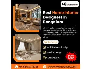 Vivid Kreations is the leading home interior designer in Bangalore, creating beautiful and functional spaces that reflect your lifestyle. We focus on innovative designs that combine comfort, style and practicality. Our team manages every detail with care, creating seamless planning, execution and finishing. We use premium materials, modern techniques and creative concepts to transform ordinary homes into inspiring living spaces. Our approach makes every room feel personalized, balanced and aesthetically engaging. We take pride in crafting designs that elevate your life. Get in touch with Vivid Kreations today for stylish, functional and affordable interior design.