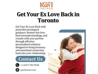 Get your ex love back in Toronto with Psychic Ravi's powerful solution to reunite with your ex. The methods he uses to restore broken relationships, heal emotional blocks, and bring harmony back into your life are based on deep insight and proven spiritual techniques. With expert guidance from us, you can take the first step toward love and happiness today.