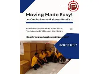9216111657 Looking for reliable packers and movers within your apartment complex? Piyush International Packers and Movers offers safe, fast, and affordable intra-apartment shifting services. Whether you are moving to another floor, tower, or block, our trained team ensures careful packing, secure handling, and damage-free relocation of your household items. We use high-quality packing materials and modern equipment to make your apartment shifting smooth and stress-free. Trust us for professional service, timely execution, and complete peace of mind during your move.