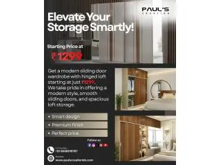Paul’s Creation offers premium wardrobe designs crafted by leading interior designers in Bangalore, blending style, functionality, and affordability. Our sliding-door wardrobe with hinged loft, starting at just ₹1299, enhances storage while giving your space a sleek, modern touch. We use high-quality materials, smart layouts, and expert craftsmanship to ensure long-lasting durability and smooth usability. Our customized design options help you maximize space without sacrificing aesthetics. Call Paul's Creation today if you're looking for a stylish and practical wardrobe solution.