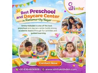 Simha Kidsden is one of the best preschool and daycare center in Ramamurthy Nagar providing a supportive and joyful environment for early learning. We create a safe space where curiosity grows and confidence builds every day. Our program focuses on overall development through play-based activities, creative learning and structured guidance. We encourage communication, social skills and independent thinking in every child. Our trained educators give personalized attention to support emotional and academic growth. We maintain a secure, vibrant campus designed for comfort and exploration. Get in touch with Simha Kidsden today to give your little one a safe, joyful and inspiring start.