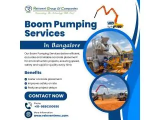 Reinvent RMC provides effective and affordable boom pumping services in Bangalore to meet the needs of all types of construction projects. We use high-capacity boom pumps that ensure consistency, speed and reduced labor costs when pumping concrete. Our skilled operators handle every project safely and accurately, delivering concrete even to the most challenging locations. Reinvent RMC provides timely service, modern equipment and smooth concrete placement for residential, commercial and industrial projects. Our concrete pumping expertise can increase your construction efficiency. Call Reinvent RMC today for boom pumping services in Bangalore.