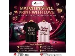 Kapricorn Prints offers premium couple t-shirt printing in Bangalore designed to help couples express their love in a unique and stylish way. We create high-quality custom t-shirts with creative designs, vibrant colors, and comfortable fabrics perfect for special occasions, photoshoots, anniversaries, or everyday wear. Our team focuses on precise printing, durable materials, and attractive styles to ensure every couple gets a personalized look they will love. We make matching couple outfits fun and memorable with our modern printing technology. Contact Kapricorn Prints today to create your perfect custom couple t-shirt.