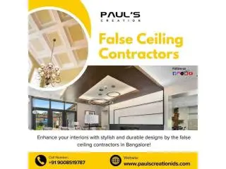 Paul’s Creation is one of the top false ceiling contractors in Bangalore, known for delivering innovative and stylish ceiling solutions for homes and commercial spaces. We specialize in designing and installing modern false ceilings that enhance interior aesthetics and functionality. Our expert team uses premium materials and advanced techniques to ensure durability and perfection in every project. We offer customized designs that suit your style and budget. Contact Paul's Creation today for professional false ceiling services that transform your space.