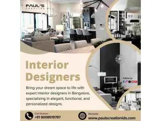 Paul’s Creation offers expert interior designers in Bangalore dedicated to transforming your spaces into elegant, functional, and stylish environments. We specialize in residential and commercial interiors that reflect your personality and lifestyle. Our team combines creativity with modern design trends to craft customized solutions that enhance comfort and aesthetics. We ensure quality materials, timely execution, and professional service from concept to completion. Whether you’re renovating your home or designing a new office, we bring your vision to life with precision and passion. Contact Paul's Creation today for beautiful, long-lasting interiors.