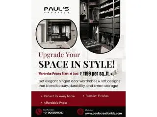 Paul’s Creation elevates your home with refined style and master craftsmanship as one of the top luxury interior designers in Bangalore, specializing in hinged door wardrobes and loft solutions. We create premium, space-smart wardrobes that combine beauty with everyday convenience, ensuring each design maximizes both aesthetics and functionality. Our team is committed to using high-quality materials, perfect finishes, and customized concepts that match your lifestyle and design vision. We turn simple spaces into luxurious, organized interiors tailored just for you. Reach out to Paul’s Creation today for elegant interiors that truly enhance your living experience.
