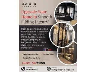 Paul’s Creation is a leading name in luxury interior design in Bangalore, known for creating elegant, comfortable, and functional living spaces. We offer premium solutions, including stylish sliding wardrobes and contemporary floor-to-ceiling glass designs starting at just ₹1599 per sq.ft. Our expert team brings innovative ideas and detailed craftsmanship to transform every room into a beautifully curated space that matches your lifestyle and vision. Whether you're upgrading a single room or your entire home, we ensure a luxurious experience tailored to your needs. Contact Paul’s Creation today to transform your home with sophisticated, high-quality interiors.