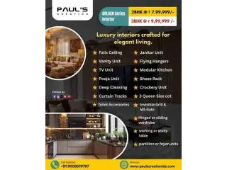 Paul’s Creation is one of the best residential interior designers in Bangalore, offering exclusive GOLD Series 3BHK & 2BHK interior solutions crafted for modern families. We design elegant living spaces that combine comfort, functionality, and luxury. Our services include modular kitchens, wardrobes, TV units, false ceilings, pooja units, and customized storage solutions. We use premium materials, innovative layouts, and contemporary finishes to reflect your lifestyle. We focus on quality execution, timely delivery, and personalized designs that enhance everyday living. Contact Paul’s Creation today to transform your home into a stylish and functional masterpiece.