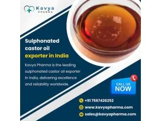 Kavya ****** stands among the most reliable sulphonated castor oil exporters in India, dedicated to offering premium-quality products that adhere to international standards. We provide reliable and consistent chemical solutions for a wide range of industrial applications. Our expert team conducts detailed quality checks on every batch to ensure purity, performance, and customer satisfaction. We continue to lead with innovation and excellence with an efficient supply chain, timely delivery, and a strong global footprint. Contact Kavya ****** today for superior sulphonated castor oil and exceptional service you can rely on.